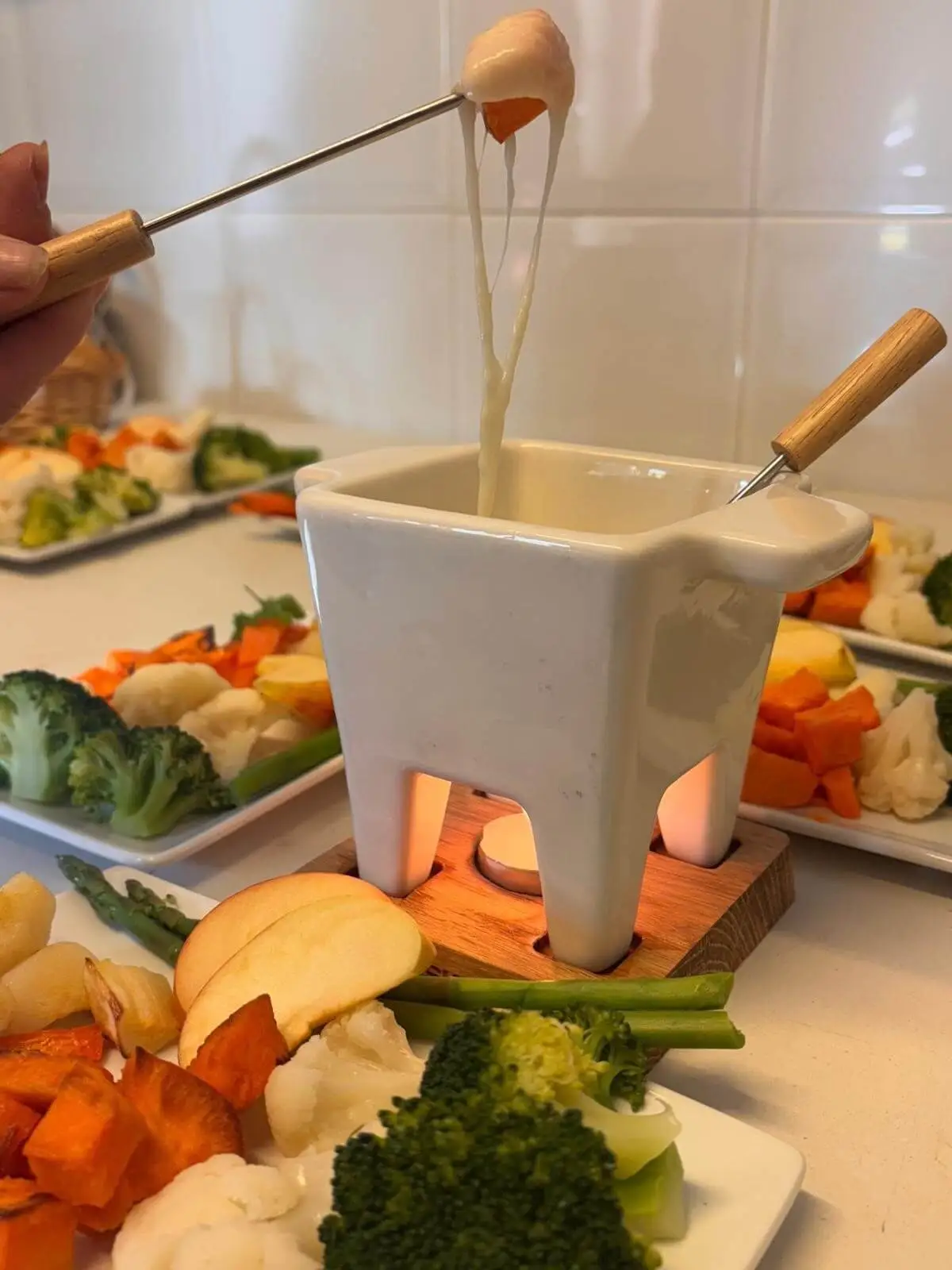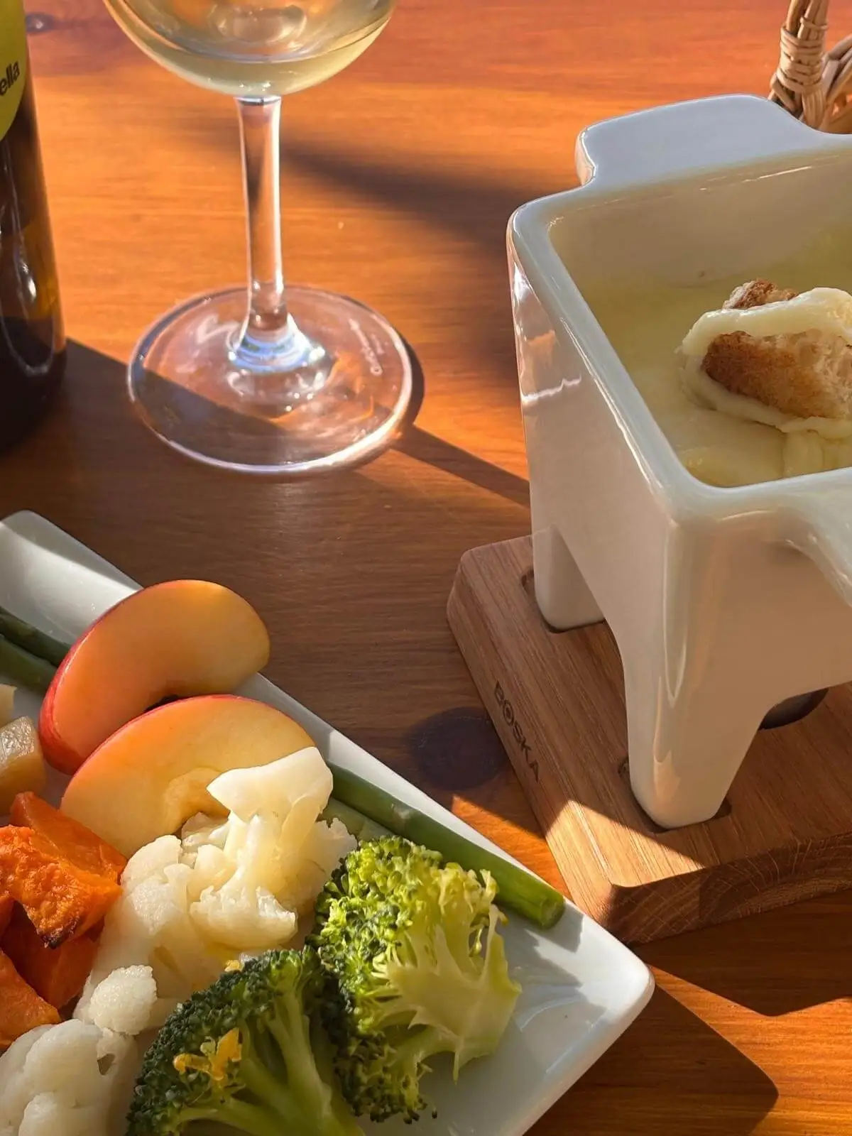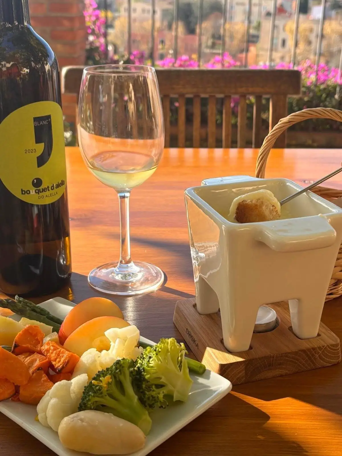 Bouquet d’Alella Pansa Blanca 2024 + Mini fondue au fromage. Fondue traditionnelle infusée au vin blanc Bouquet d’Alella. Servie avec du pain et des légumes de saison et de proximité tels que broccolini, asperges, chou-fleur ou pommes de terre nouvelles.