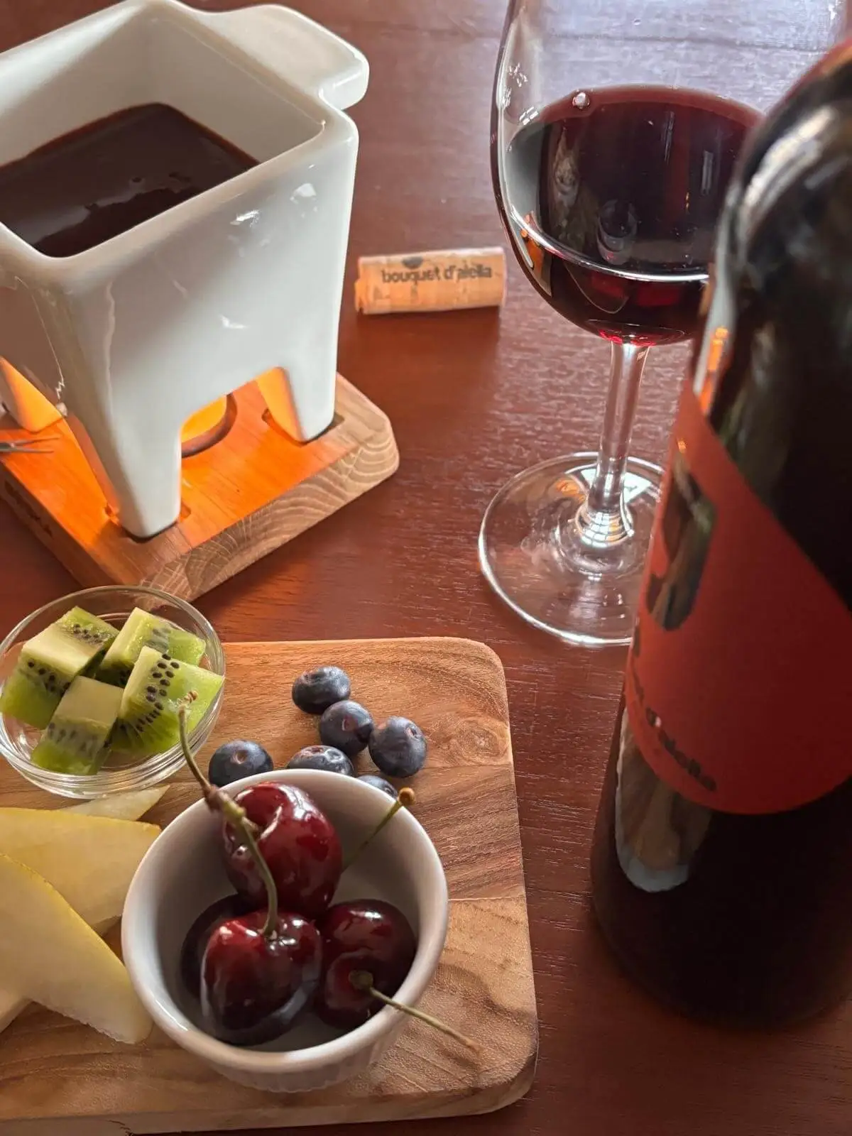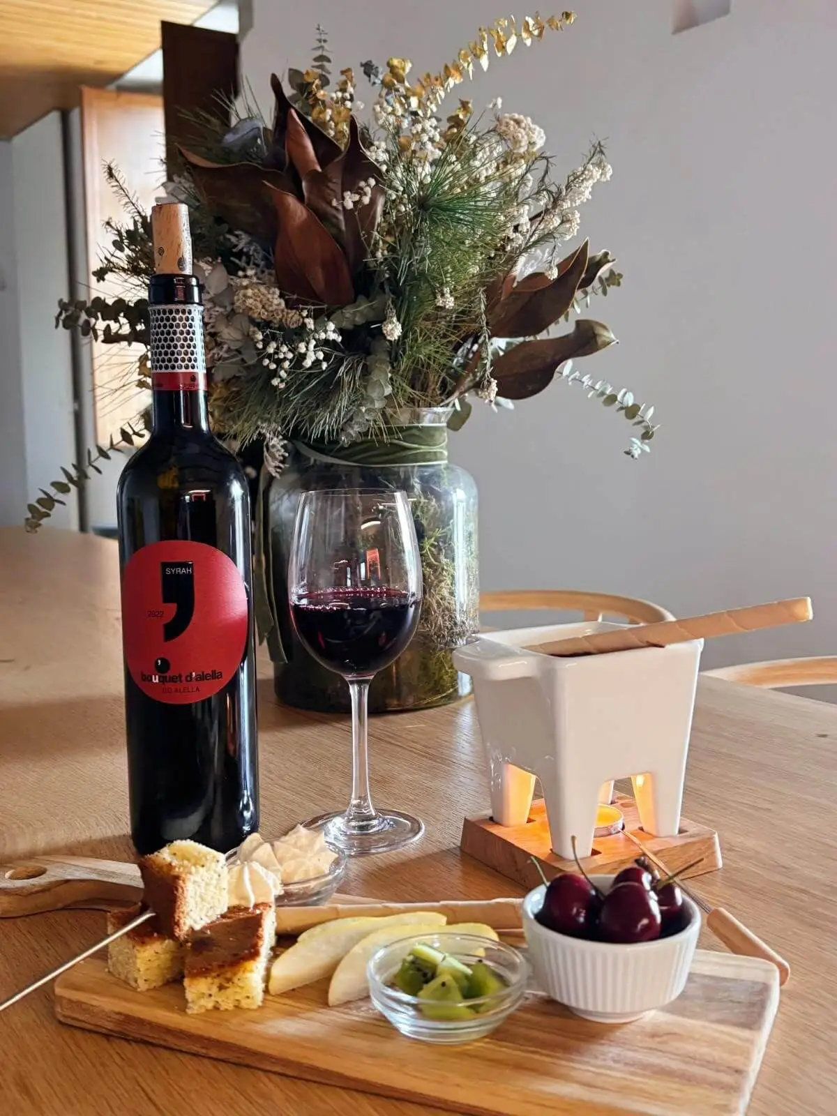 Bouquet d’Alella Syrah 2023 + Mini fondue au chocolat. Accompagnée de fraises du Maresme, de génoise maison et de meringues croustillantes élaborées avec les œufs de notre ferme.